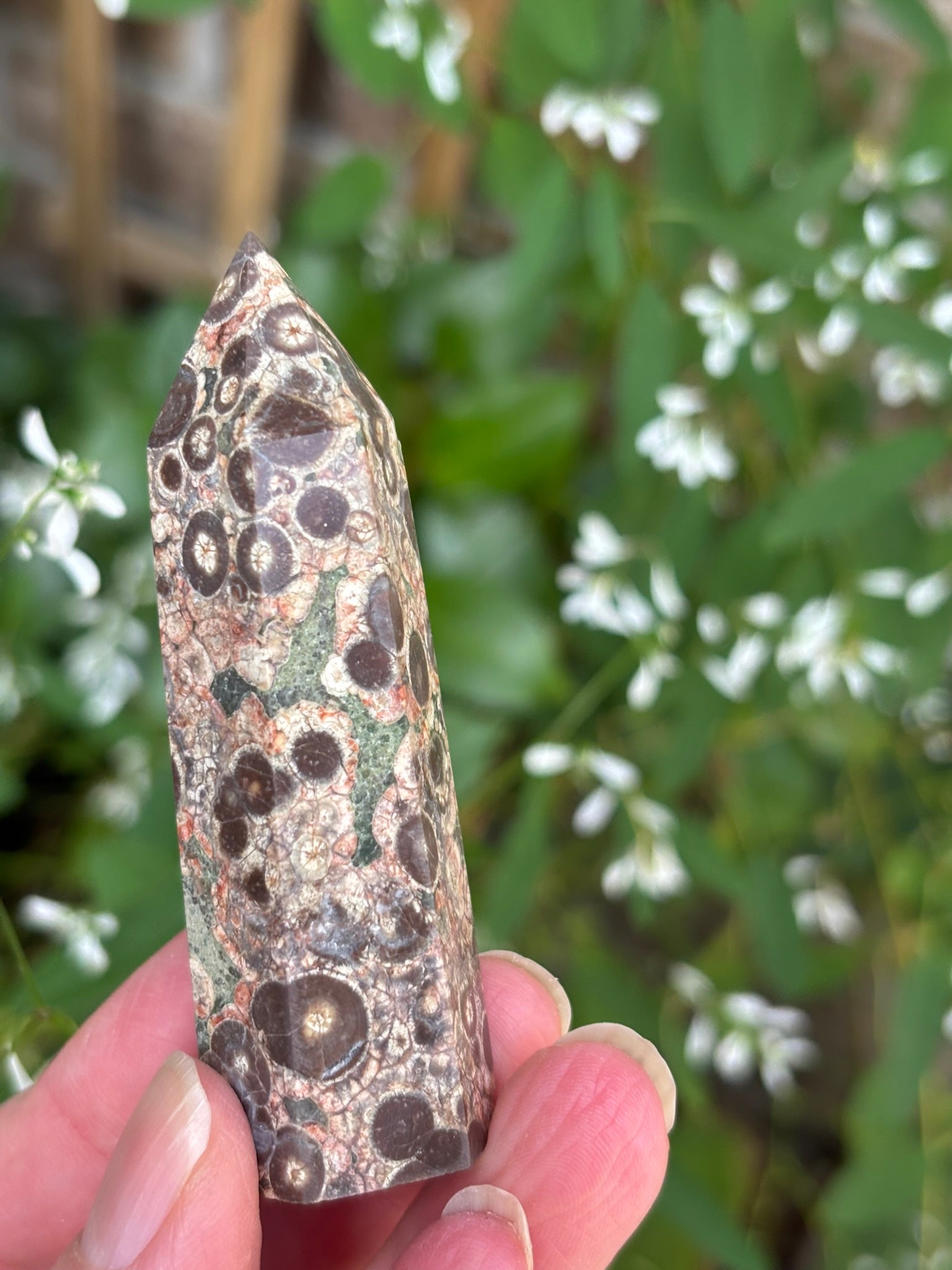 Rainforest Jasper's metaphysical properties include promoting a deep connection to nature and Earth healing, fostering emotional balance and strength, enhancing creativity and passion, and supporting self-respect, confidence, and spiritual renewal. This stone is associated with the Heart and Solar Plexus chakras, and it aids in adapting to change, overcoming negative habits, and realizing one's life purpose. It is often called the "Stone of Gaia" due to its strong ties to the Earth.