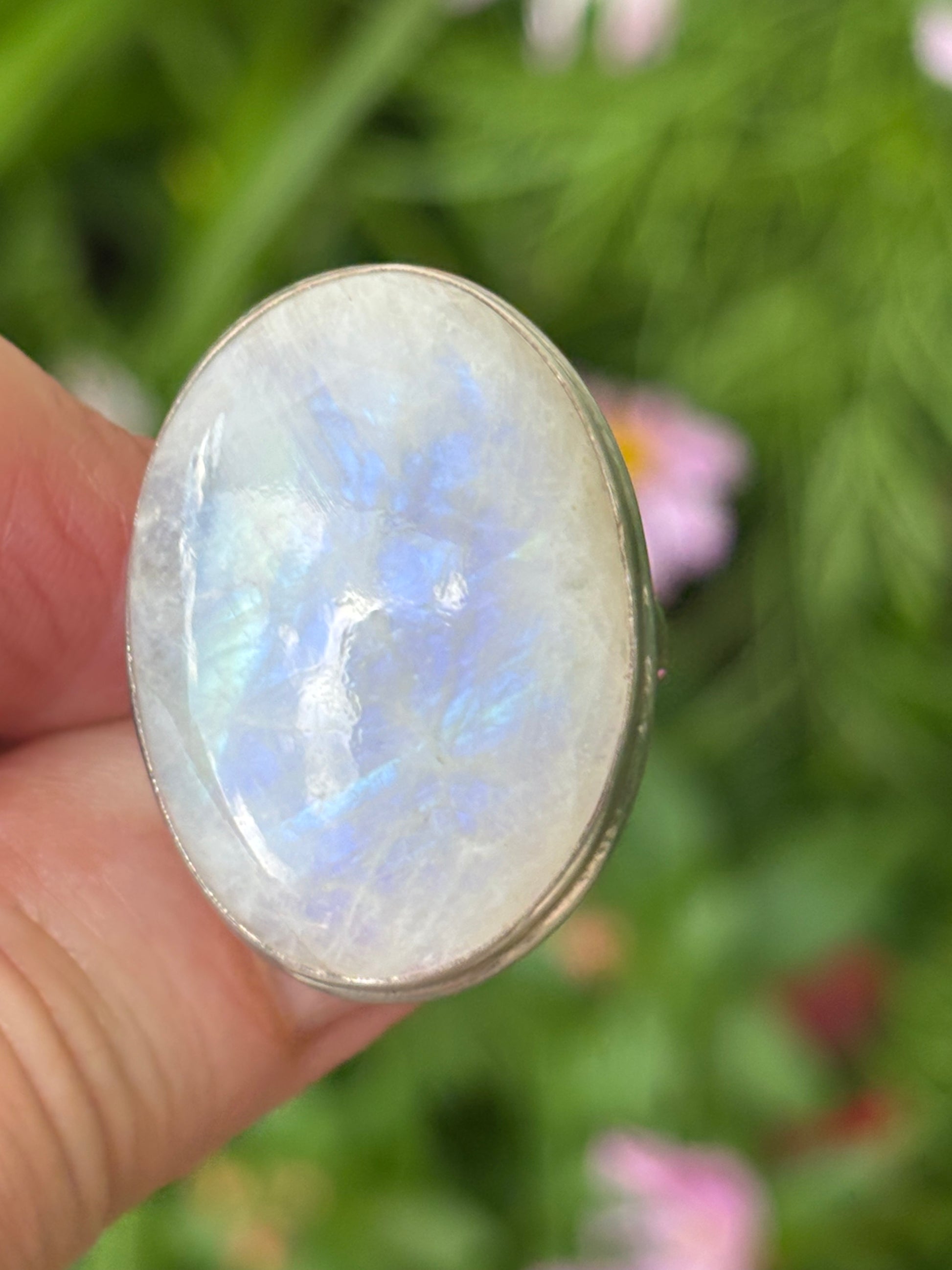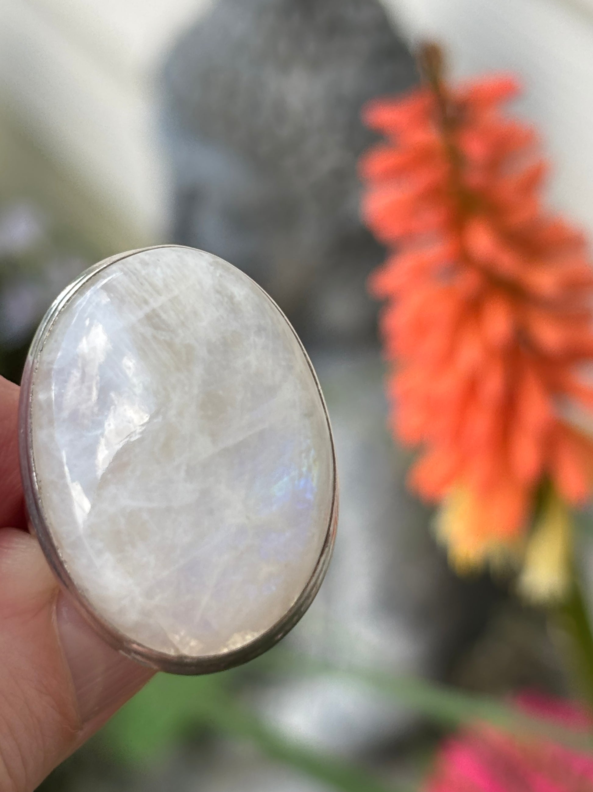 Radiant Rainbow Moonstone sits in a thick sterling silver setting. Rainbow Moonstone resonates a comforting energy. It connects us with Divine inspiration and channels it into our own intuition.